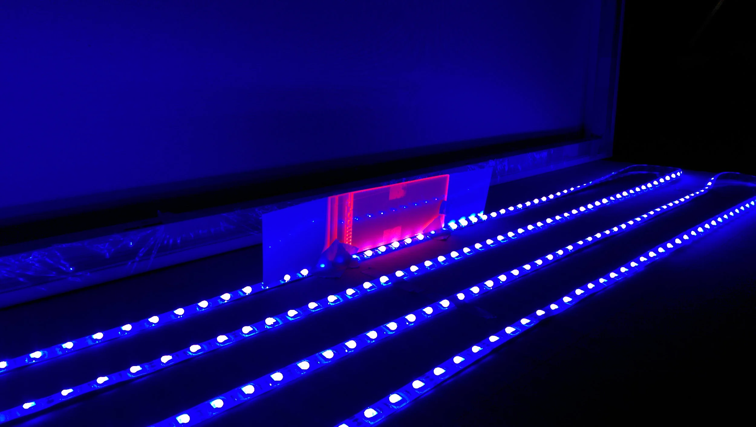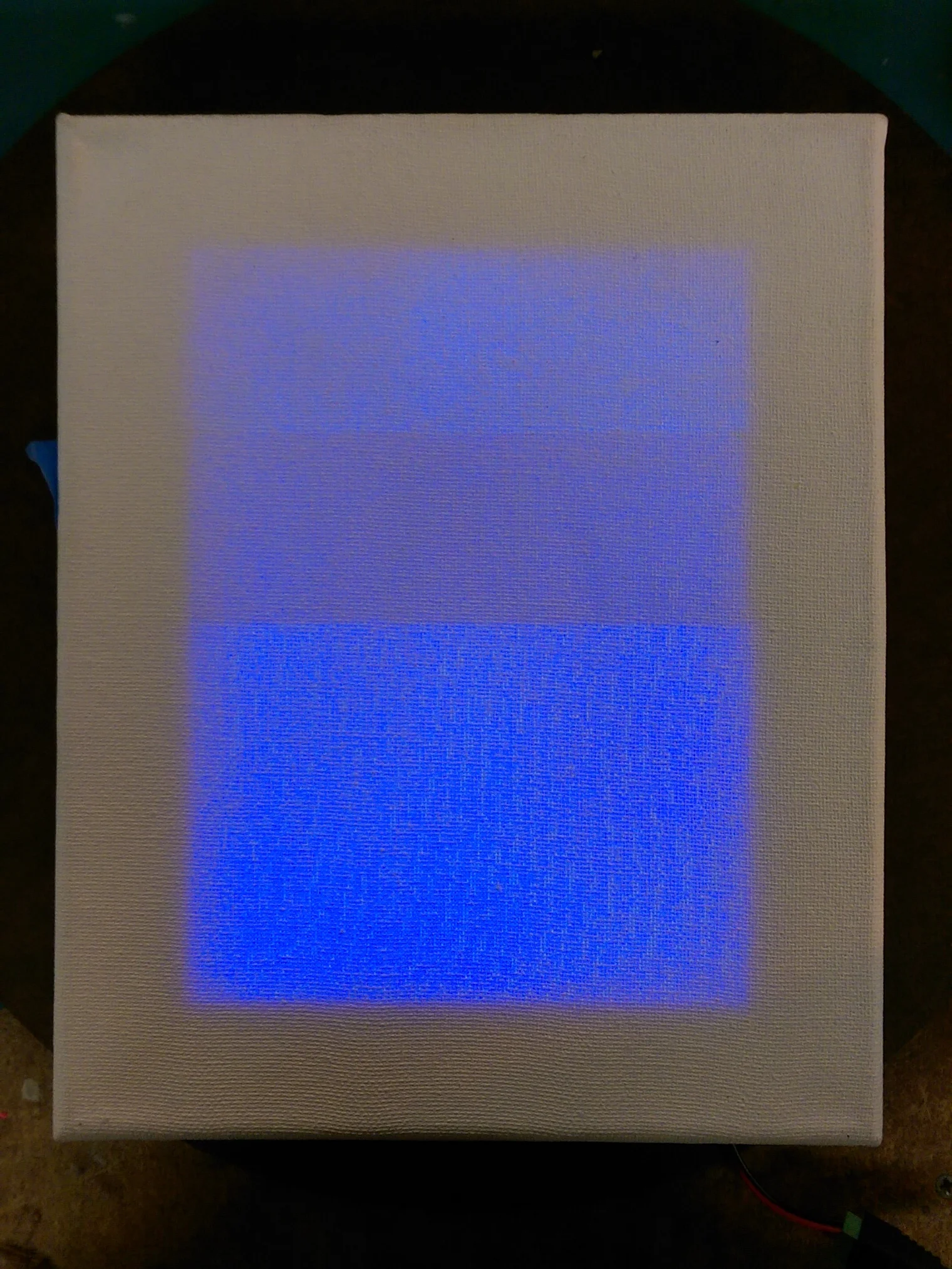 Ensuring that the interior construction didn't produce any unwanted shadows wasn't trivial. Everything inside the canvas frame had to be below the plane of LEDs or it would cast a shadow, so wires were pushed into their own slots. Photo paper also had to be attached to the beveled underside of the frame. This acted as additional reflection around the border, making it possible to achieve completely uniform edge-to-edge lighting on the exterior canvas surface. To ensure that the canvas was pristine when hung for the first time, I kept the original shrink wrap packaging intact while constructing and assembling everything inside.