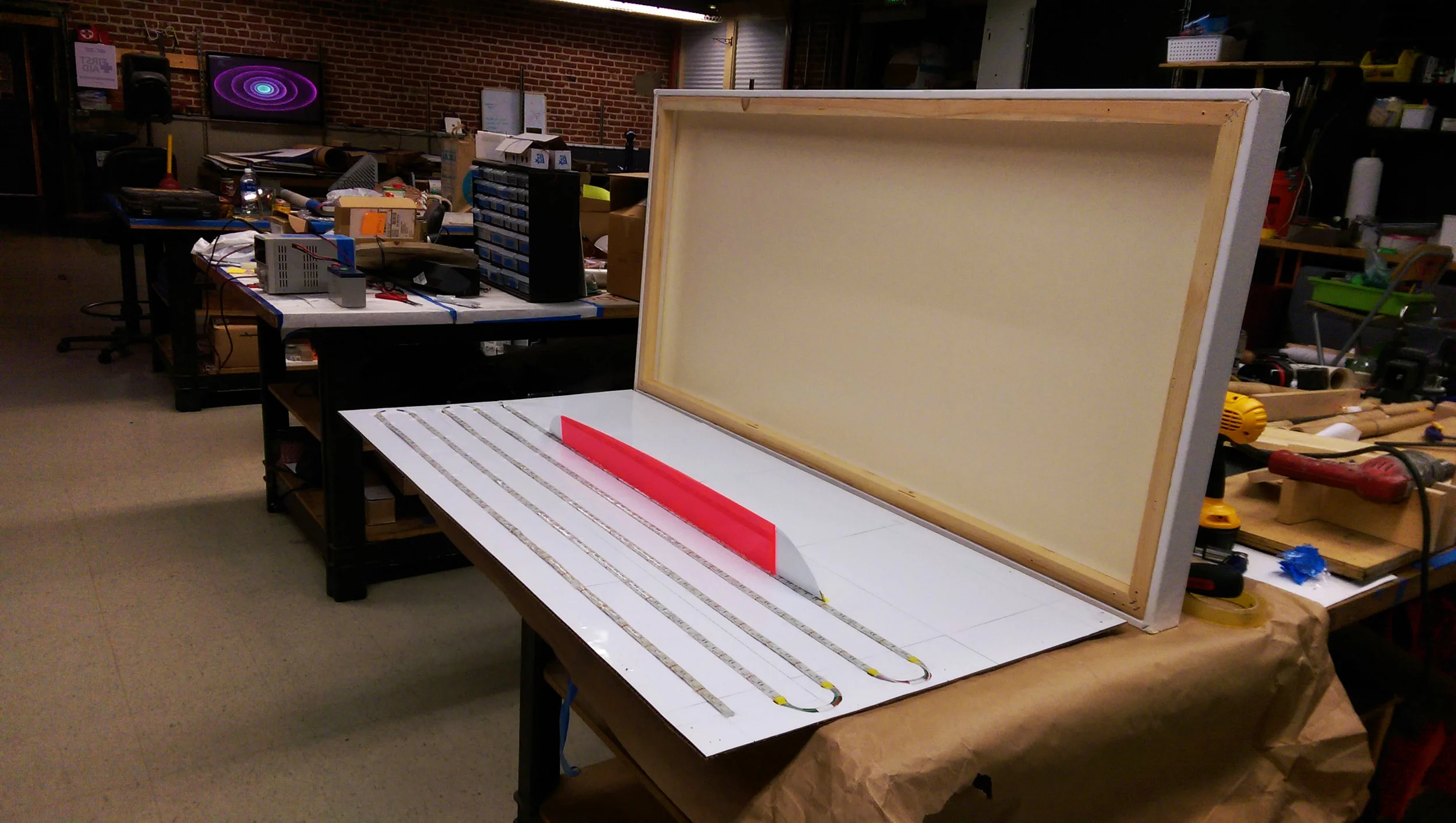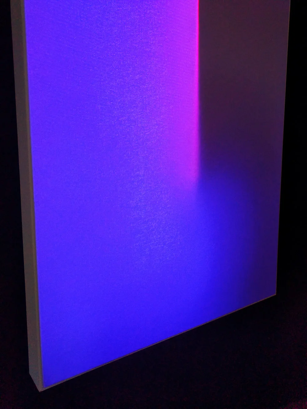 I also worked hard to create interesting sculptural and edgelit effects using a fluorescent acrylic panel. The surfaces of this panel were kept as pristine as possible to maximize the amount of total internal reflection and minimize any light leakage aside from the final diffusing surface. It was sized just barely taller than the canvas thickness to create the slightest hint of a contour along the centerline of the piece.